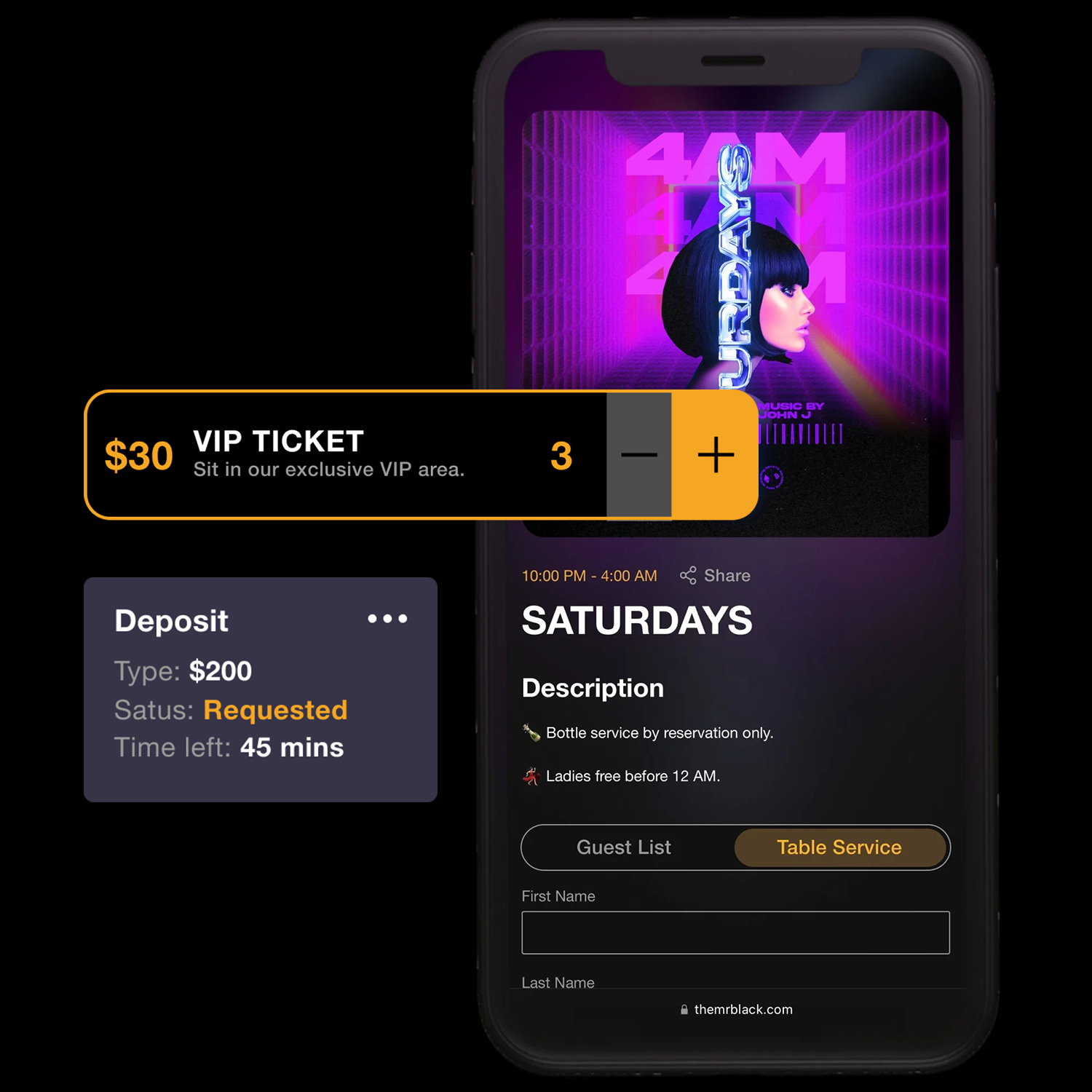 The Mr. Black Nightclub App allows you to manage your business with ease. Increase guestlist and bottle service reservations, and make it simple for customers to book reservations via social media, your website, or through promoters.